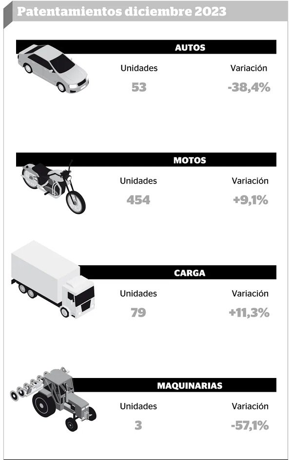 En diciembre del año pasado se patentaron en todo el país 9.316 autos, 33.583 motos, 8.915 vehículos de transporte y carga, 909 máquinas agrícolas y 566 acoplados, cifra que indicó una baja del 20,8% respecto de los patentamientos registrados en el mismo mes de 2022 en el caso de los automóviles. Para Catamarca, hubo una fuerte caída en el patentamiento de los cero kilómetro, aunque ligera suba de las motocicletas.