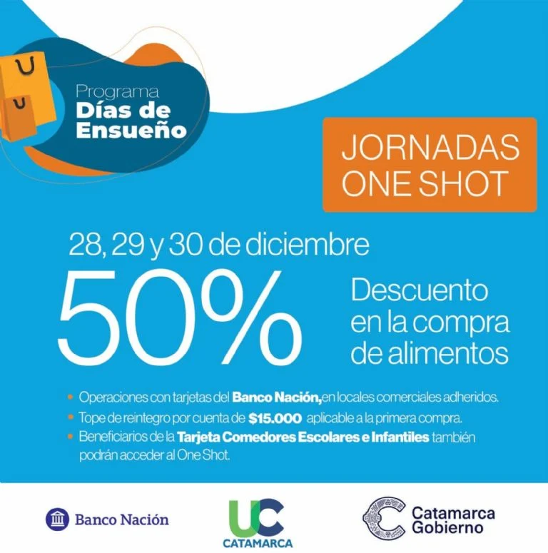 El Ministerio de Economía anunció que las Jornadas One Shot Alimentos que se articulan con el Banco Nación Argentina y la Unión Comercial de Catamarca se realizarán desde este jueves y hasta el sábado 30 de diciembre, en las mismas condiciones en que se vienen llevando a cabo hasta aquí.
