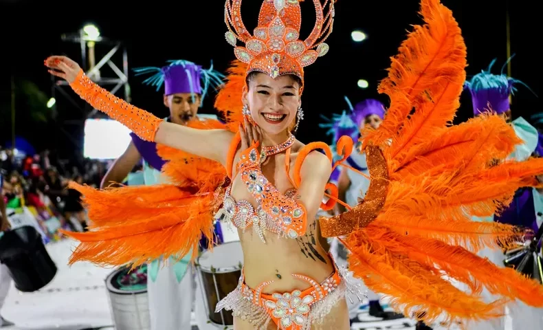 Mari – Mari, la comparsa que llegó desde Gualeguaychú brindó sus imponentes bailes y vestuarios, que trasladó imaginariamente al litoral del país.