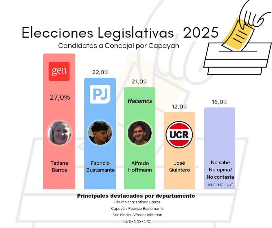 En la recta hacia las Elecciones Legislativas 2025, el termómetro político local marca a Tatiana Barros (GEN), Fabricio Bustamante (PJ) y Alfredo Hoffmann (Hacemos) como las principales figuras en la intención de voto, seguidos por José Quintero (UCR) y un sector que aún no definió su postura.