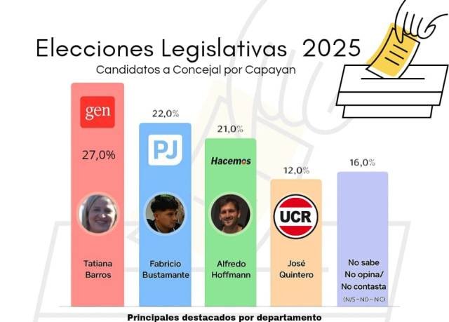 En la recta hacia las Elecciones Legislativas 2025, el termómetro político local marca a Tatiana Barros (GEN), Fabricio Bustamante (PJ) y Alfredo Hoffmann (Hacemos) como las principales figuras en la intención de voto, seguidos por José Quintero (UCR) y un sector que aún no definió su postura.
