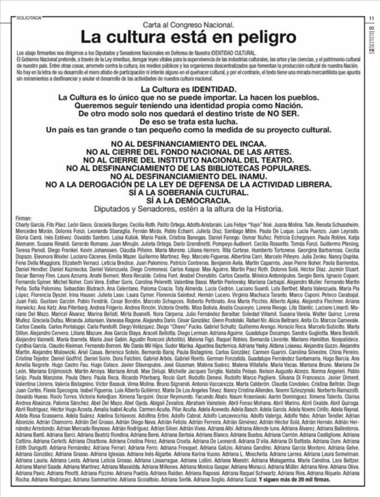 «El Gobierno Nacional pretende, a través de la Ley Ómnibus, derogar leyes vitales para la supervivencia de las industrias culturales, las artes y las ciencias, y el patrimonio cultural de nuestro país», dice uno de los fragmentos del texto, que cuenta con un apoyo masivo de referentes de la cultura nacional de todos los sectores.