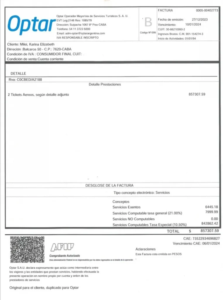 Según anticiparon desde el sitio La Política Online, el pasaje de Milei se emitió por medio de Optar, el Operador Mayorista de Servicios Turísticos de Aerolíneas. El Ejecutivo saca los pasajes de los funcionarios por medio de ese sistema y un particular no puede hacerlo.