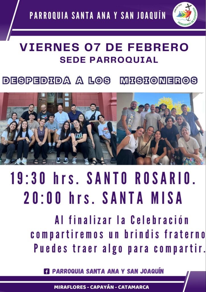 La parroquia Santa Ana y San Joaquín lo invita a la celebración de la santa misa y despedida de nuestros hermanos misioneros que están en nuestra comunidad desde el día sábado 1 de febrero los mismos están en la comunidad de nueva Coneta, lo Ángeles villa norte y sur y en Miraflores, ellos son de la provincia de Buenos Aires y estuvieron visitando y animando a la comunidad.
