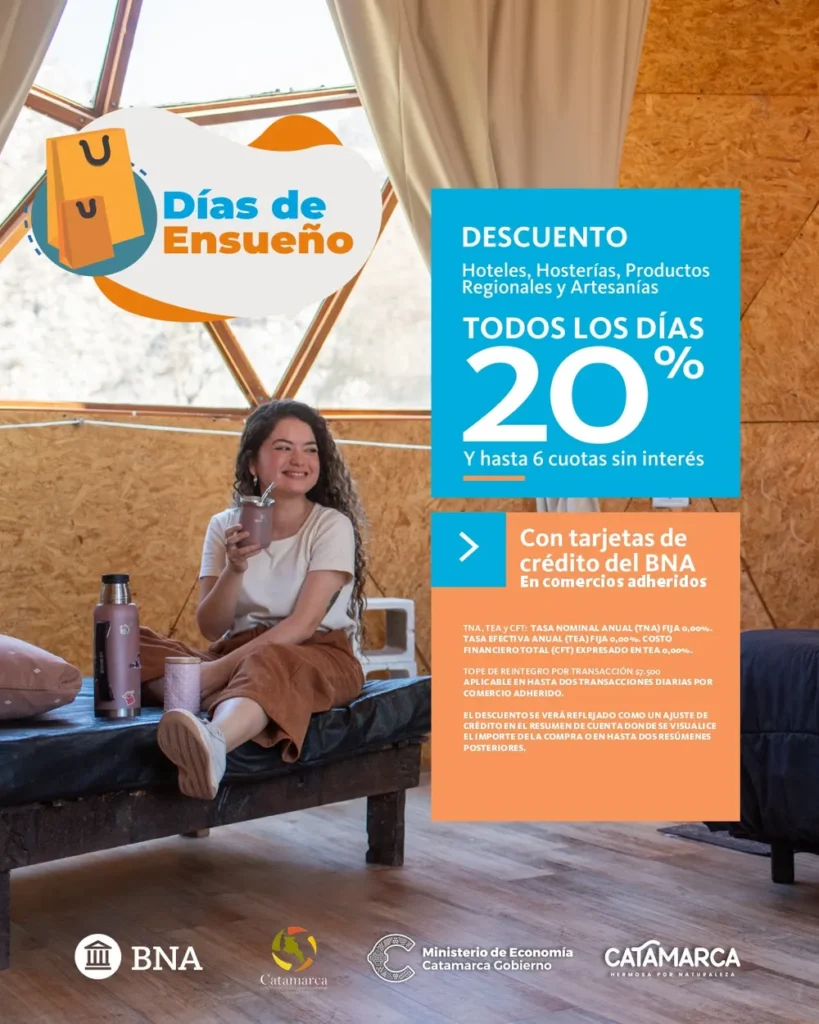 Con este beneficio, el Programa Días de Ensueño acompaña el movimiento del sector turístico en Catamarca, por lo que es importante resaltar que la promoción puede ser utilizada tanto por las personas que visiten Catamarca como por los propios catamarqueños, siempre y cuando realicen operaciones en comercios locales y con tarjetas de crédito del Banco Nación.