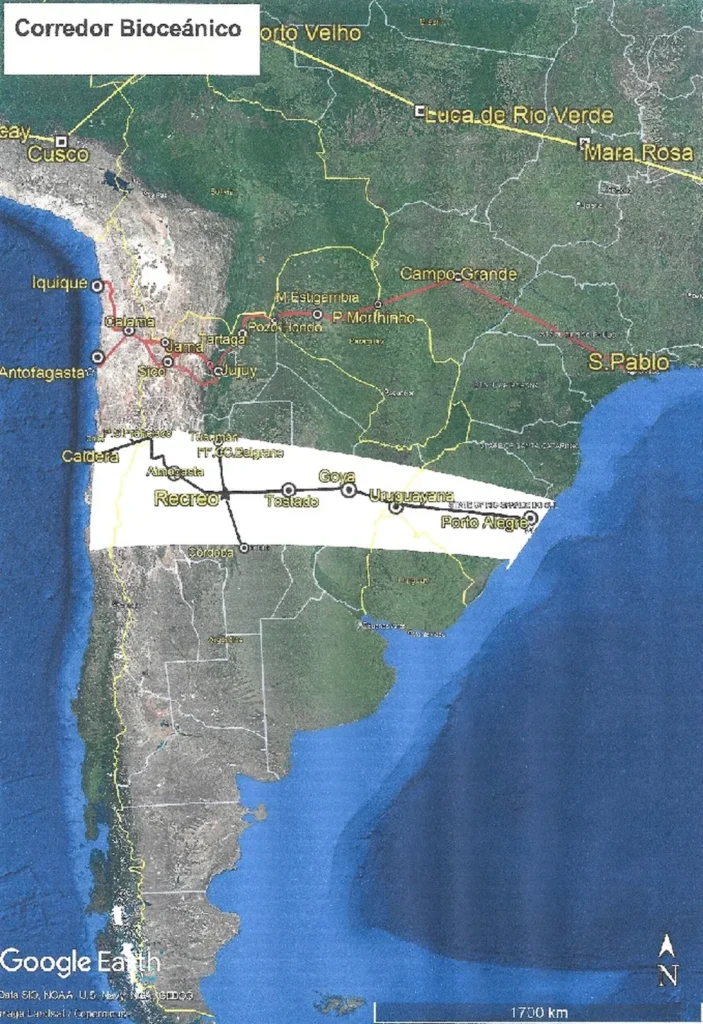 Esta situación hace necesaria la consideración de un corredor bioceánico, no por razones idealistas sino por razones económicas y geopolíticas, para sobrevivir como país. Esto nos demanda saber de que hablamos cuando nos referimos a un Corredor Bioceánico. Obviamente no estamos hablando de una mera ruta de paso al servicio del comercio, sino de un corredor de desarrollo trinacional, donde una ruta vial y/o unas vías ferroviarias, más un conjunto de servicios de soporte tienen que ser la columna vertebral de un espacio de progreso. El corredor final que visionamos a futuro, sugerido en el mapa abajo, arranca en Puerto Caldera, Chile, o sea la Tercera Región con capital en Copiapó, entra por Paso San Francisco a nuestro país, lo cruza de oeste a este para llegar a Uruguayana y entrar en Brasil y conectarnos al Atlántico en los estados de Paraná, Río Grande do Sul y Santa Caterina, con unos 27 millones de habitantes y 18% del PBI nacional. Un corredor con un impacto económico y cultural en un espacio de 2.000 km de largo por unos 500 Km de ancho!