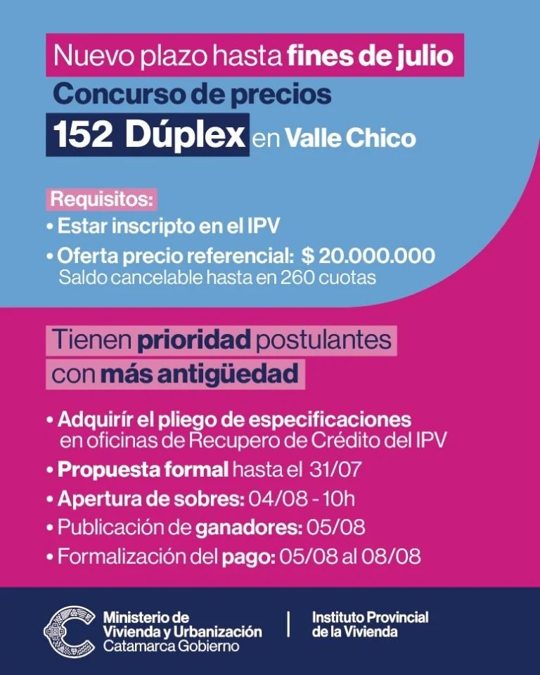 Con el objetivo de facilitar el acceso a más familias catamarqueñas y garantizar la continuidad de una obra clave para la provincia, el Instituto Provincial de la Vivienda resolvió extender hasta fines de julio el plazo para participar del concurso de precios y participación por 152 dúplex ubicados en Valle Chico.
