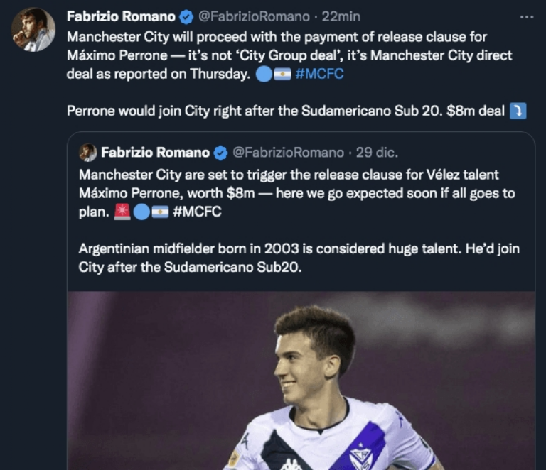 Según informó Fabrizio Romano, especialista en mercado de pases, el City ya tomó la decisión de ejecutar la cláusula de rescisión de 8 millones de euros por Maximiliano Perrone, jugador (por ahora) de Vélez.