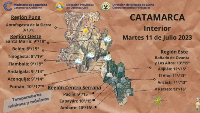 El Servicio Meteorológico Nacional emitió una alerta amarilla por vientos para este martes y miércoles. La zona afectada es Cordillera de Antofagasta de la Sierra y Tinogasta; Puna de Tinogasta, Antofagasta de la Sierra, Belén y Santa María.