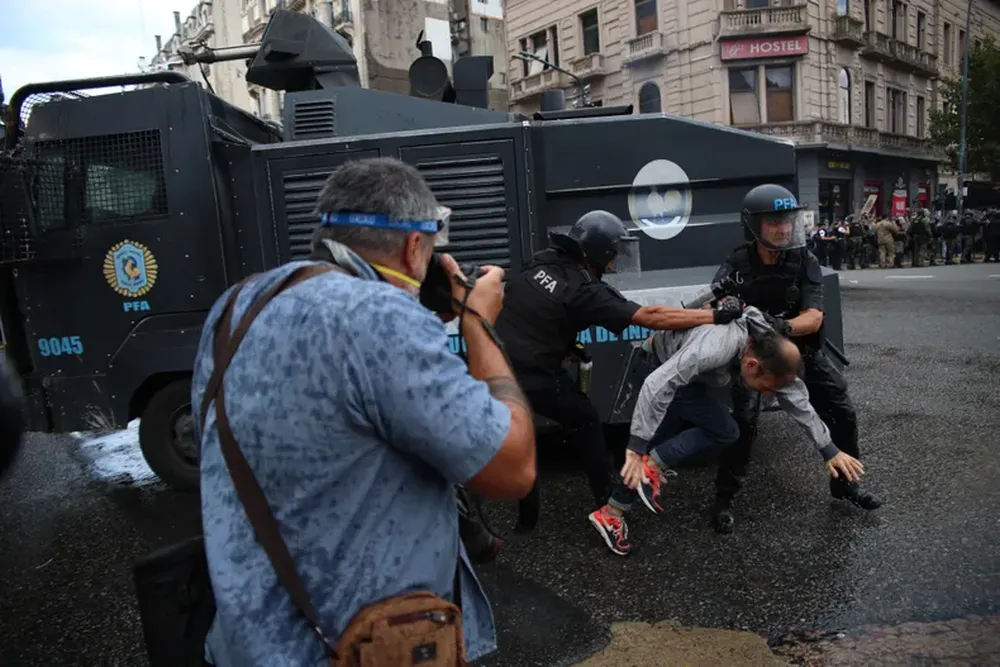 Si bien la convocatoria era para las 17 horas, a las 15 la Plaza del Congreso ya estaba repleta de jubilados e hinchas de distintos clubes de todo el país. Allí se registraron los primeros momentos de tensión con los efectivos que no permitían que los manifestantes bajen a Avenida Entre Ríos.