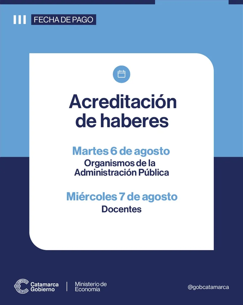 Los empleados de la administración pública cobrarán los haberes de julio el próximo martes 6 de agosto, en tanto que al día siguiente, el miércoles 7, será el turno de los docentes. La información fue dada a conocer por parte del Ministerio de Economía de Catamarca.