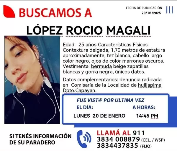 La División Trata de Personas de la Policía de la Provincia difundió a través de sus redes sociales, en un llamado a la comunidad, que se busca dar con el paradero de Roció Magali López, una joven de 25 años de edad que fue vista por última vez este lunes a las 14:45 de la tarde en Capayán.