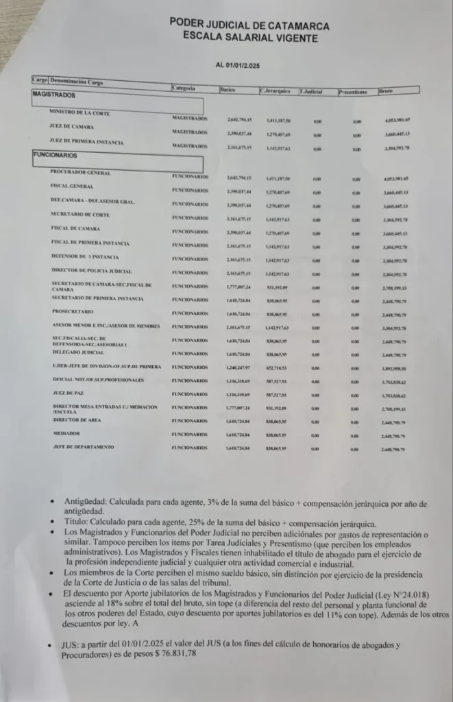 En la nota enviada a El Ancasti, la Corte asegura que sus miembros no cobran ningún nuevo adicional, y que «los magistrados y funcionarios del Poder Judicial no perciben adicionales por gastos de representación o similar. Tampoco perciben ítems por Tareas Judiciales y Presentismo. Los magistrados y fiscales tienen inhabilitado el título de abogado para el ejercicio de la profesión independiente judicial y cualquier otra actividad comercial o industrial».