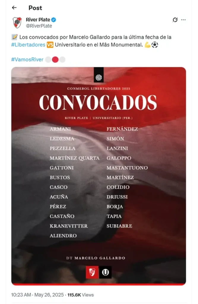 River buscará cerrar la fase de grupos de la Copa Libertadores con una victoria en el Estadio Monumental ante Universitario de Perú, este miércoles desde las 21. Con la clasificación asegurada a octavos, el equipo de Marcelo Gallardo va por un triunfo que lo deje como el segundo mejor primero del certamen y así posicionarse mejor para los cruces. De cara a ese encuentro, que será el último antes del Mundial de Clubes en junio, el Muñeco convocó a 23 futbolistas, con una baja sensible en defensa y una esperada reaparición en ofensiva.