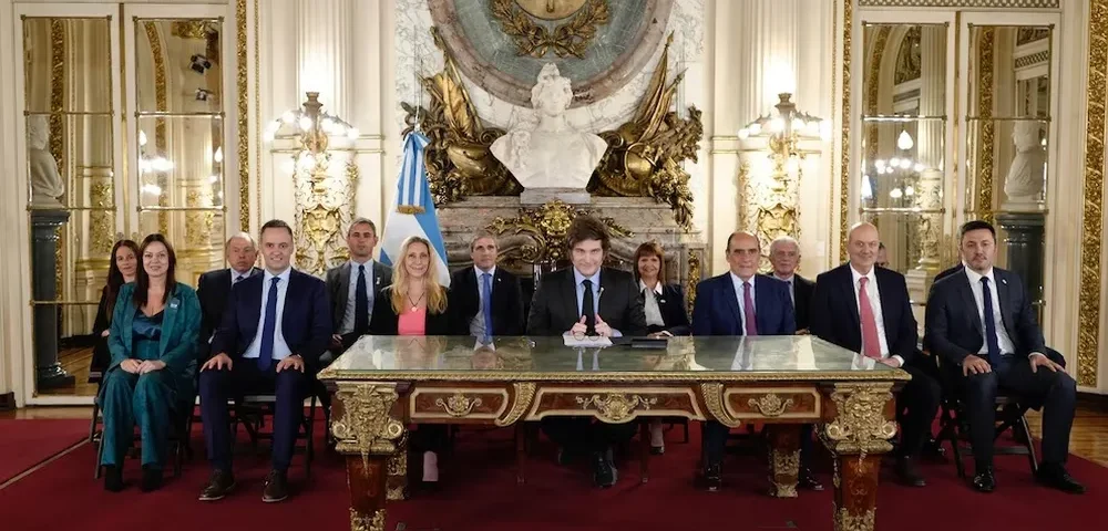 Luego de los anuncios económicos de Luis Caputo y Santiago Bausili de que, entre otras cosas, este lunes se flexibilizará la compra de dólares, el presidente Javier Milei difundió un mensaje en cadena nacional junto a todo su Gabinete para dar un fuerte tono político de celebración y agradecer al Fondo Monetario Internacional y otros organismos por el respaldo económico. Allí, adelantó que la Argentina recibirá, en total, 32.000 millones de dólares y que las reservas del Banco Central llegarán a los 50.000 millones. También aseguró que esto, sumado a la «caída de la inflación», habilitará más crecimiento de la economía.