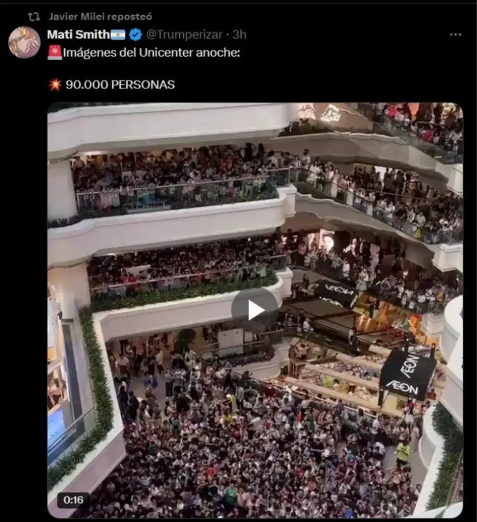 En las vísperas de Navidad, el presidente Javier Milei compartió una publicación donde un usuario celebraba que «90.000» personas se habían acercado al shopping Unicenter, ubicado en la localidad bonaerense de Martínez, con el objetivo de realizar compras para las fiestas. Sin embargo, las imágenes correspondían a un centro comercial en la ciudad de Guangzhou, China.