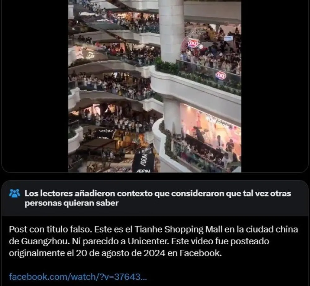 Milei se hizo eco de una publicación de un usuario de X, quien publicó el vídeo con supuestas imágenes del Unicenter, el centro comercial más grande de la Argentina. Los usuarios de X se dieron cuenta de las discrepancias con la fachada del edificio argentino, como la diferencia en la cantidad de pisos y que los carteles estaban en la lengua asiática.