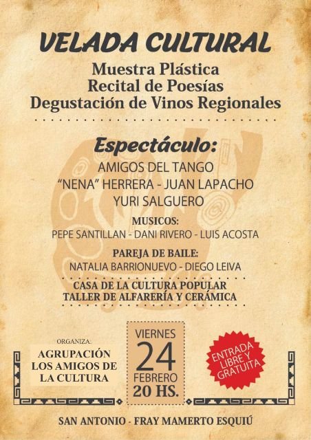 La Casa de la Cultura Popular de San Antonio (Fray Mamerto Esquiú), será escenario de una velada organizada por la “Agrupación Amigos de la Cultura”, este viernes a partir de las 20 horas.