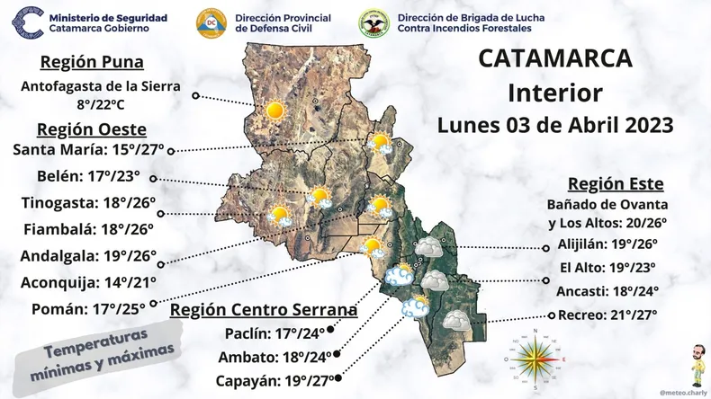 El pronóstico del tiempo que preparan los profesionales del Observatorio Climatológico de la Universidad Nacional de Catamarca dice que hoy empezamos la semana con bastante nubosidad e inestabilidad; se espera que el cielo esté parcialmente nublado y la temperatura será de 18ºC la mínima y 28ºC la máxima, el viento entre brisas a moderados del sector sur y la probabilidad de precipitaciones es entre el 10 y 40% por la tarde y la noche.