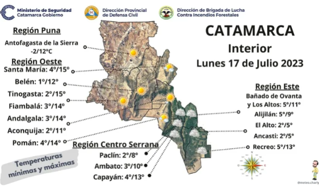 El pronóstico del tiempo elaborado por los profesionales del Observatorio Climatológico de la Universidad Nacional de Catamarca dice que el día de hoy tendremos el cielo cubierto, el viento pasará de leves a regulares con velocidades que pueden alcanzar los 38km/h desde el sector norte, en tanto que la temperatura máxima será solo de 13°C y 4°C la temperatura mínima. Durante la mañana hay entre un 10 y 40% de probabilidad de precipitaciones. Además, hay una alerta por frío y Catamarca figura dentro de este mapa.