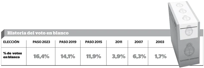 Hacia atrás tampoco hay registros similares, aunque los contextos eran distintos y aún no estaban en vigencia las primarias. En la general de 2011 el voto en blanco fue del 3,9%, en 2007 fue del 6,3% y en 2003, del 1,7%. En estas últimas tres elecciones, los comicios fueron desdoblados del esquema nacional.