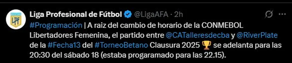 Este viernes comenzará una nueva fecha del Torneo Clausura, una jornada 13 cargada de encuentros, pero que uno de los platos principales será Talleres vs. River. Mientras la expectativa de los cordobeses y de los millonarios crece por ver el partido, la Asociación del Fútbol Argentino comunicó una modificación de última hora:el partido sufrió un cambio de horario.