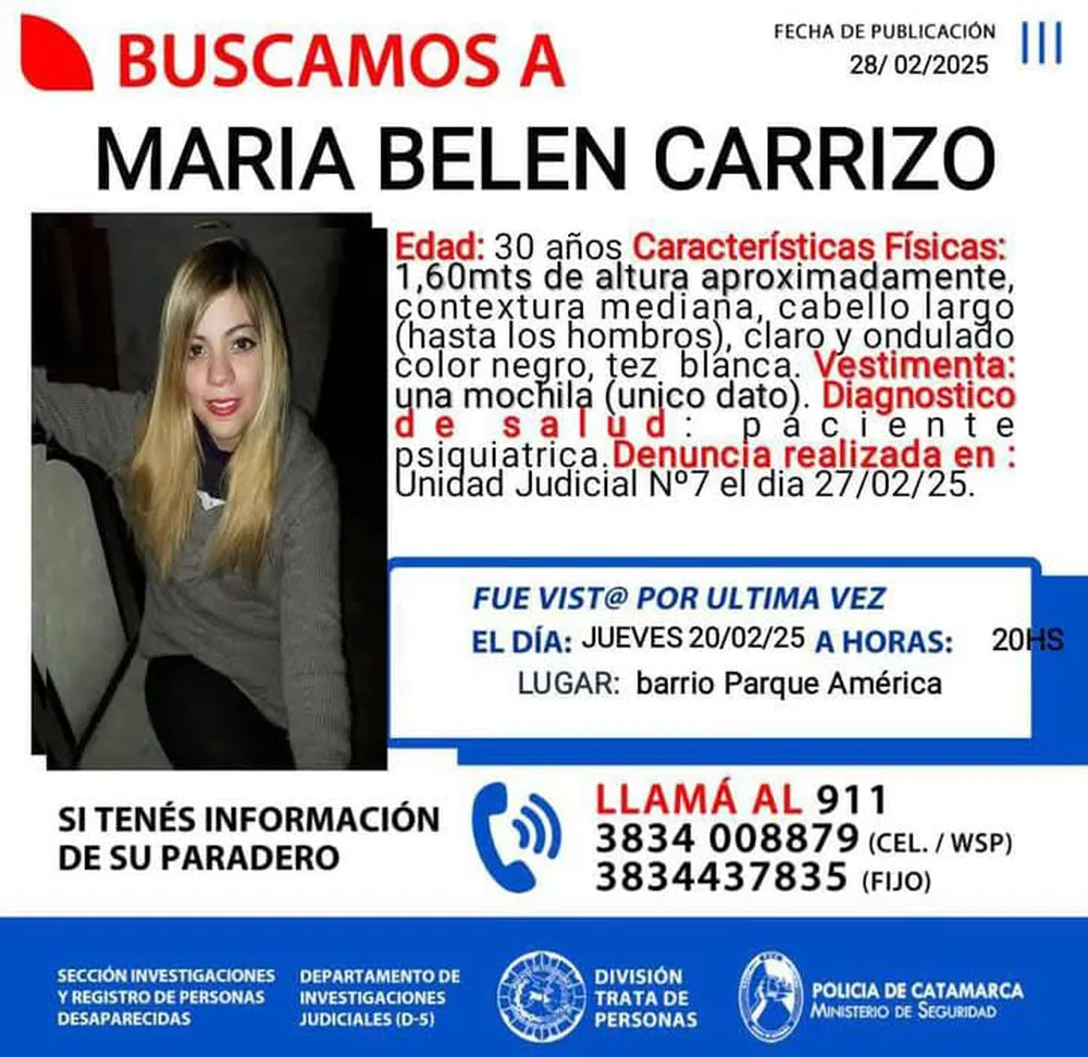 Policía de Catamarca, en conjunto con la División Trata de Personas y la Sección de Investigaciones y Registro de Personas Desaparecidas, trabajan en la búsqueda de María Belén Carrizo, una joven de 30 años de edad, quien fue vista por última vez el día jueves 20 de febrero a las 20hs., en el barrio Parque América.