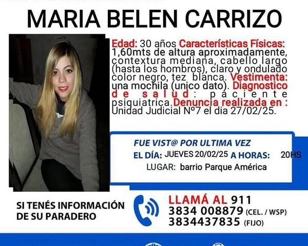 Policía de Catamarca, en conjunto con la División Trata de Personas y la Sección de Investigaciones y Registro de Personas Desaparecidas, trabajan en la búsqueda de María Belén Carrizo, una joven de 30 años de edad, quien fue vista por última vez el día jueves 20 de febrero a las 20hs., en el barrio Parque América.