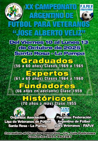 Santa Rosa se prepara para recibir a más de 1600 jugadores de veteranos de futbol que llegarán de distintos puntos del país para participar en esta nueva edición del nacional de veteranos, que se disputará entre los días 10 al 13 de octubre, con la participación de cuatro categorías Graduados 56 a 60 años; Expertos 61 a 65 años; Fundadores 66 a más años e Históricos. Esta última tendrá su debut en estos certámenes, comprendiendo a futbolistas de más de 70 años de edad.