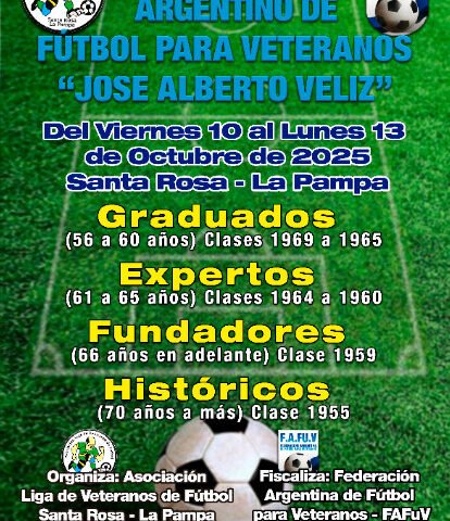 Santa Rosa se prepara para recibir a más de 1600 jugadores de veteranos de futbol que llegarán de distintos puntos del país para participar en esta nueva edición del nacional de veteranos, que se disputará entre los días 10 al 13 de octubre, con la participación de cuatro categorías Graduados 56 a 60 años; Expertos 61 a 65 años; Fundadores 66 a más años e Históricos. Esta última tendrá su debut en estos certámenes, comprendiendo a futbolistas de más de 70 años de edad.