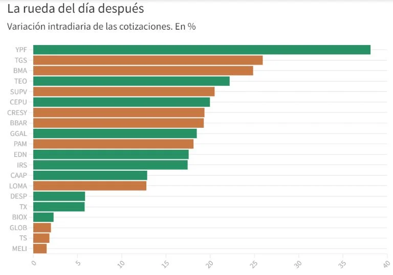 Tal fue el efecto de la victoria, que los los American Depositary Receipts (ADRs) de empresas argentinas que cotizan en Wall Street experimentaron un notable ascenso. Se destaca un salto de 38,12% para los títulos de la petrolera con control estatal YPF (llegó a saltar 42% durante la rueda), en los 14,82 dólares. También destacaban los papeles bancarios, con ganancias de hasta 24,85% encabezadas por Banco Macro.