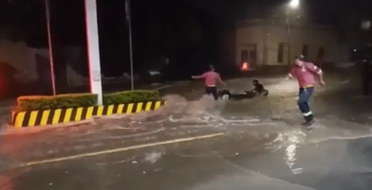 En las imágenes se observa cuando el delivery, que circula por avenida Güemes, pierde el control de su motocicleta por la fuerza del agua y comienza a ser arrastrado por la corriente. Al advertir la situación, los trabajadores de la estación de servicio corrieron para ayudarlo.