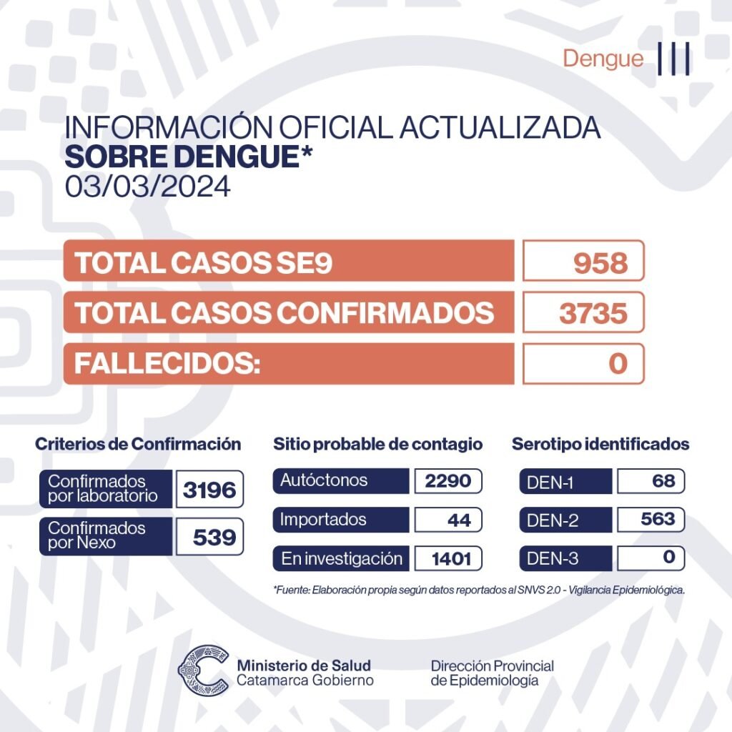 El Ministerio de Salud informa que durante la Semana Epidemiológica 9, del 26 de febrero al 03 de marzo de 2024, se registraron 958 nuevos casos de Dengue en la Provincia.