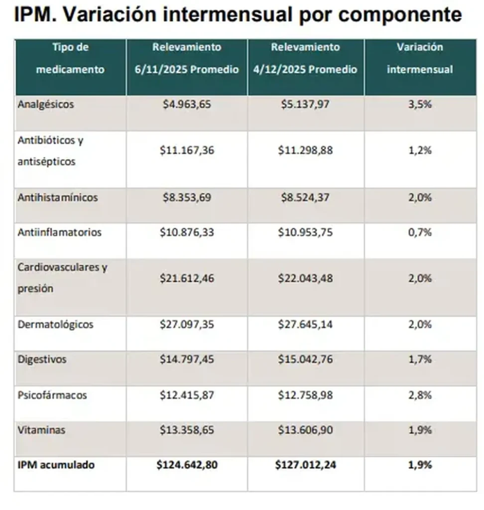 Un punto no menor tiene que ver con el alza sostenida de medicamentos que, en el caso de los más usados por jubilados, aumentaron por encima del promedio. El Índice de Precios de Medicamentos (IPM) del organismo porteño reveló que los medicamentos subieron en noviembre en promedio un 1,9% destacándose algunos con alzas mensuales significativas como los analgésicos (+3,5%), seguidos de los psicofármacos (+2,8%).