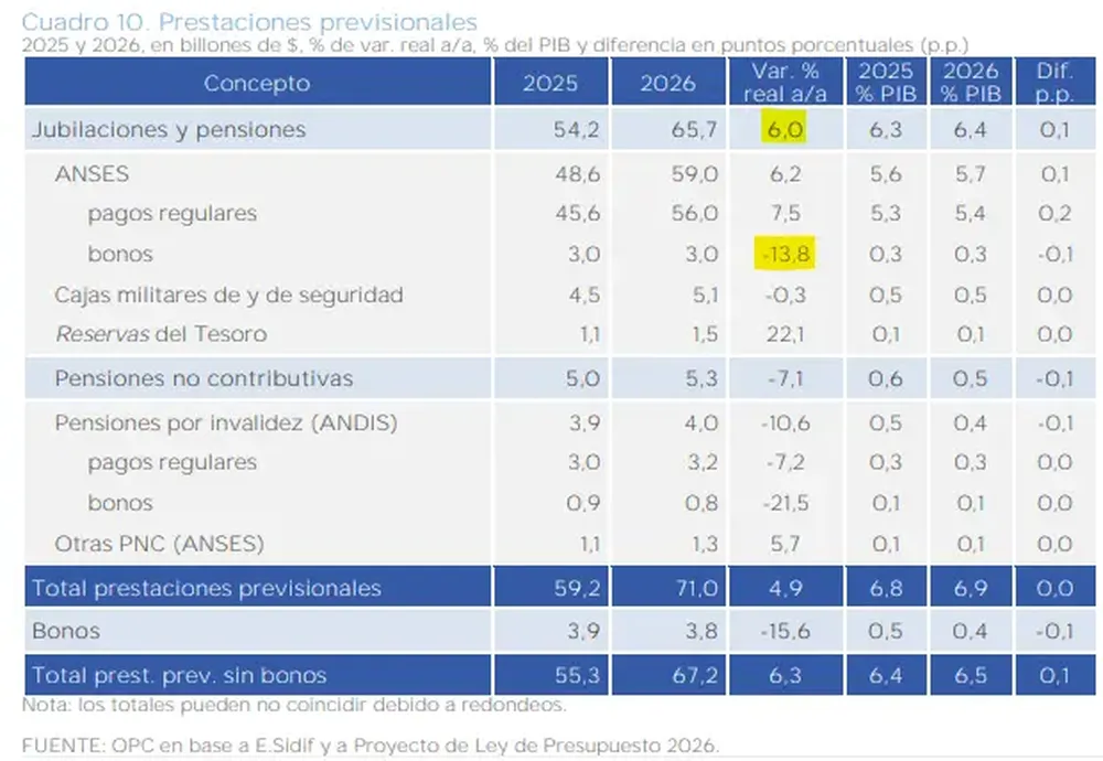 De cara a este año, el Congreso sancionó el Presupuesto 2026, el primero aprobado durante la administración de Javier Milei, luego de dos ejercicios consecutivos en los que el Ejecutivo prorrogó de manera inédita el Presupuesto 2023. Según el análisis de la Oficina de Presupuesto del Congreso (OPC), las partidas destinadas a jubilaciones registrarían un incremento real del 6%, sin embargo, los recursos asignados al bono extraordinario que perciben los jubilados de la mínima sufrirán una caída real del 13,8%, lo que supone la continuidad del monto en $70.000, sin actualizaciones, a lo largo de todo el año, tal como ocurre desde marzo de 2024. Como consecuencia del congelamiento de esos refuerzos, el informe estimó que la jubilación mínima tendría una baja real cercana al 0,6% en 2026.