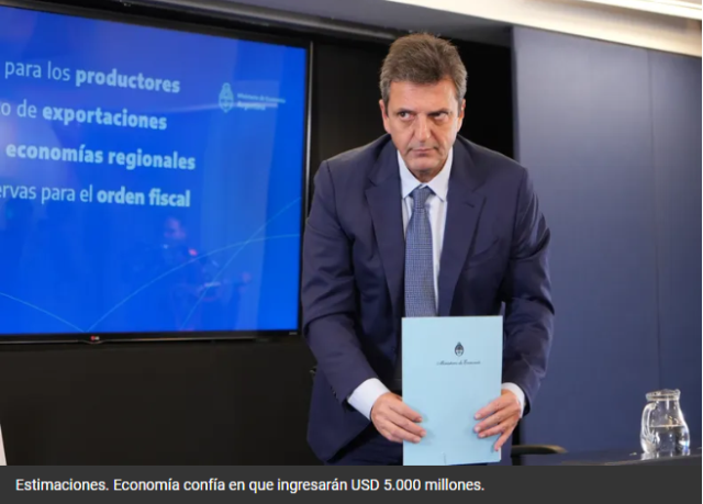 «En términos netos representa lo mismo que si fueran retenciones cero para el productor», destacó el jefe del Palacio de Hacienda. «Es una ronda lateral del Mercado Único Libre de Cambio, transitoria por 25 días que empieza el lunes y termina el 30 de septiembre», detalló.