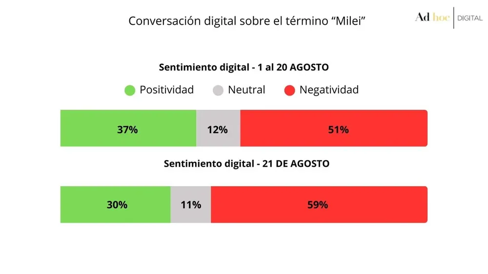 “La negatividad en la imagen digital sobre el presidente fue 7 puntos superior el día 21 de agosto al promedio mensual de este mes”, precisa el análisis difundido este viernes y menciona que “‘Karina’ y ‘Spagnuolo’ fueron los dos términos más relacionados a ‘Milei’ ayer y están en el top 5 semanal”. El estudio de Ad Hoc también indica que, en 72 hs, el caso Spagnuolo generó “un volumen superior a las repercusiones del discurso en Davos de este año”.