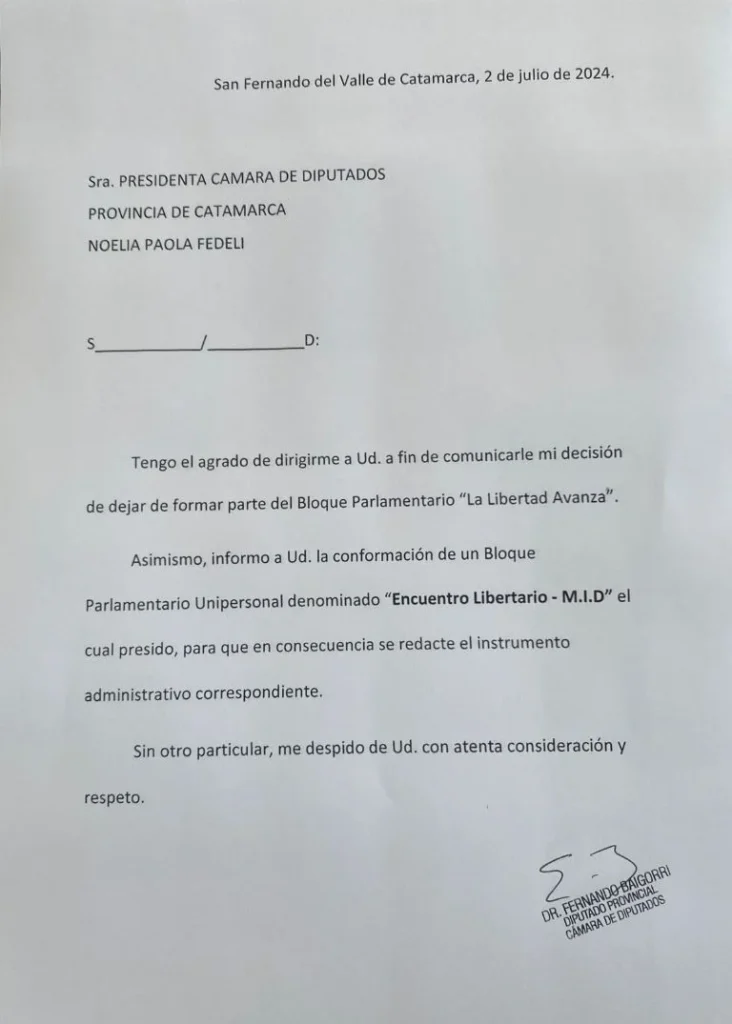 El legislador del MID, espacio que conformó alianza electoral dentro de la Libertad Avanza, Fernando Baigorri, presentó una nota a la presidenta de Diputados, Paola Fedeli, informando su decisión de despegarse del bloque violeta que conduce Adrián Brizuela.