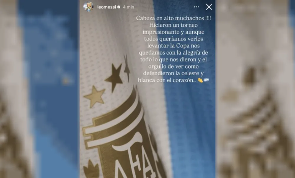 Al respecto, Lionel Messi, que ya había felicitado a los juveniles argentinos tras las semifinales, envió un mensaje de apoyo y reconocimiento a lo chicos luego de la dura derrota. “Cabeza en alto muchachos!!!! Hicieron un torneo impresionante y aunque todos queríamos verlos levantar la Copa nos quedamos con la alegría de todo lo que nos dieron y el orgullo de ver como defendieron la celeste y blanca con el corazón”, escribió el capitán de la Mayor en su cuenta de Instagram.