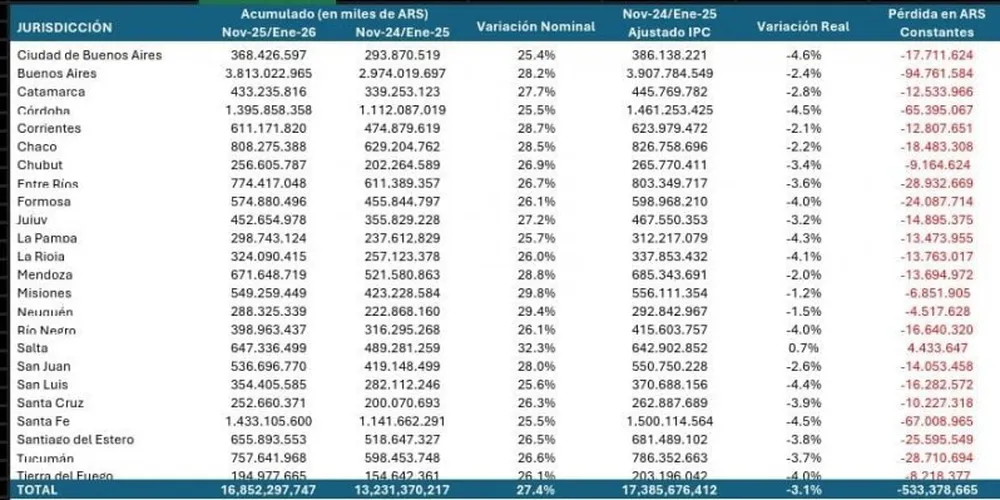 Si bien todas las jurisdicciones mostraron incrementos nominales de entre el 25% y el 33%, al actualizar los montos por inflación, 23 de las 24 provincias registraron pérdidas reales. Las más perjudicadas fueron Córdoba y Santa Fe, que en conjunto dejaron de percibir más de 130 mil millones de pesos. La Ciudad Autónoma de Buenos Aires también sufrió una caída real del 4,6%.