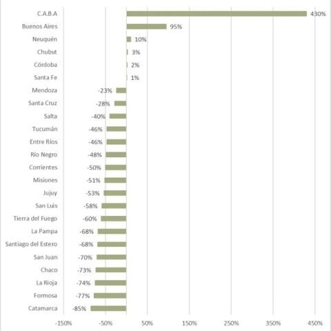 Por otro lado, las 18 jurisdicciones restantes tendrían una pérdida de ingresos respecto a la situación actual. Las tres jurisdicciones con mayor pérdida serían Catamarca (que tendría una pérdida del 85%), Formosa (con una pérdida del 77%) y La Rioja (con pérdida del 74%).