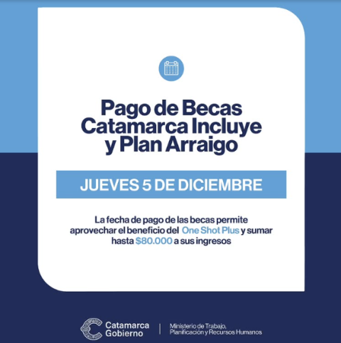 El Ministerio de Trabajo, Planificación y Recursos Humanos informa que el jueves 5 de diciembre se acreditará el pago de los beneficiarios de las becas Catamarca Incluye y Plan Arraigo, por cajero automático y entidad bancaria.
