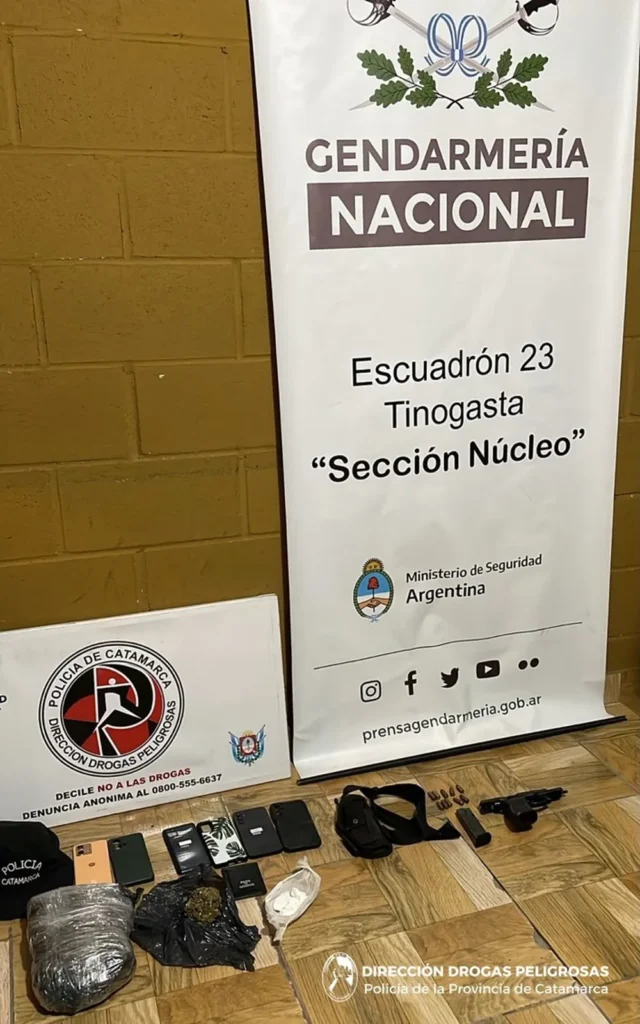 En la jornada de hoy, efectivos del Grupo Antinarcóticos de Unidades Regionales (GAUR Tinogasta), perteneciente a la Dirección Drogas Peligrosas de la Policía de la Provincia, tomaron conocimiento que un Sargento de Policía, quien presta servicio en esa Ciudad del departamento homónimo, estaría transportando sustancias estupefacientes en un vehículo particular, por lo que de inmediato dieron aviso al personal del Escuadrón N° 23 de la Agrupación VIII Catamarca de Gendarmeria Nacional Argentina, que realizaba control vehicular en el empalme de las Rutas Nacionales N° 60 y 40, a la altura de Cerro Negro.