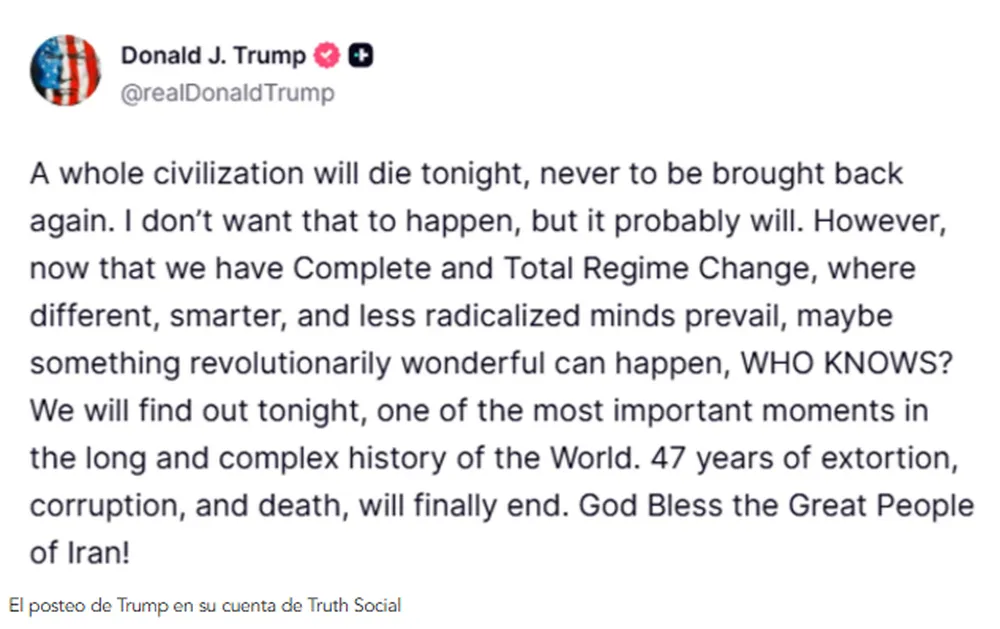 Así lo expresó Trump en su cuenta oficial de Truth Social: “Esta noche morirá toda una civilización, para no volver jamás. No quiero que eso suceda, pero probablemente ocurrirá”. “Sin embargo, ahora que tenemos un cambio de régimen total, donde prevalecen mentes diferentes, más inteligentes y menos radicalizadas, tal vez pueda suceder algo revolucionario maravilloso, ¿quién sabe?”, se preguntó el mandatario norteamericano.