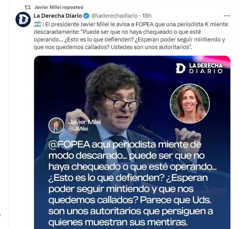 Justamente, este mismo viernes, el mandatario estuvo en redes sociales criticando a la periodista Luciana Geuna -a quien tildó de «K» (¡!)- y embistió con varios posteos contra Crónica TV.