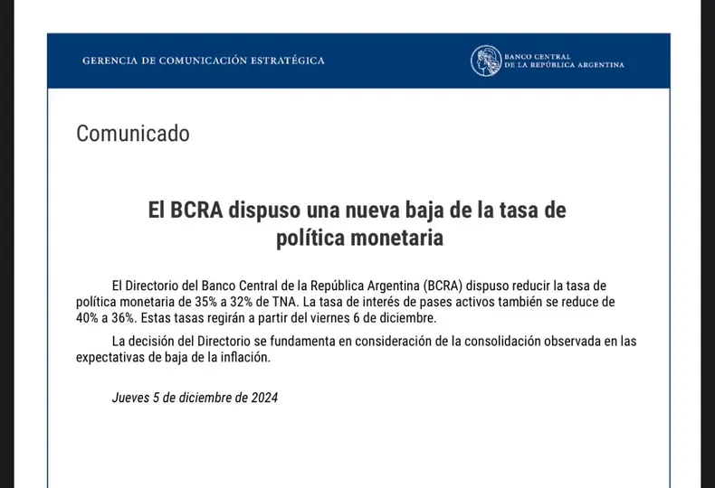 El Directorio del Banco Central de la República Argentina (BCRA) dispuso reducir la tasa de política monetaria de 35% a 32% de TNA a partir de este viernes, medida que repercutirá directamente en el rendimiento de los plazos fijos de los bancos.