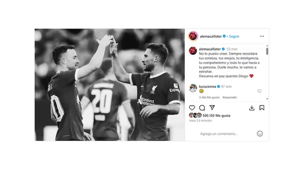 Más extenso y personal fue el homenaje de Mac Allister, quien fue compañero de Jota durante dos temporadas. El mediocampista argentino de 26 años también eligió Instagram para expresarse, donde publicó una imagen en blanco y negro en la que se los ve dándose la mano durante un partido, junto a un texto profundamente emotivo. “No lo puedo creer. Siempre recordaré tus sonrisas, tus enojos, tu inteligencia, tu compañerismo y todo lo que hacía a tu persona. Duele mucho, te vamos a extrañar. Descansa en paz querido Diogo”, escribió Mac Allister, reflejando el vínculo cercano que mantenía con el atacante portugués.
