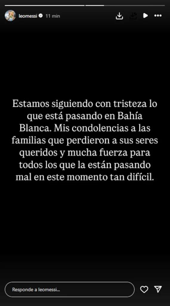 “Estamos siguiendo con tristeza lo que está pasando en Bahía Blanca. Mis condolencias a las familias que perdieron a sus seres queridos y mucha fuerza para todos los que la están pasando mal en este momento tan difícil”, escribió el capitán de la Selección argentina en una historia que posteó en su cuenta de Instagram.