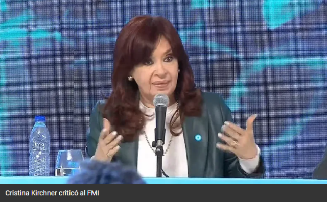 «Claro que la Argentina es una sola y tiene que hacerse cargo, pero el FMI también es uno solo. Si nosotros tenemos que hacernos cargo del desmanejo que tuvo el anterior presidente, el FMI también se tiene que hacer cargo del desmanejo de la anterior directora. Igualmente el Gobierno de los EEUU», manifestó Cristina Kirchner.