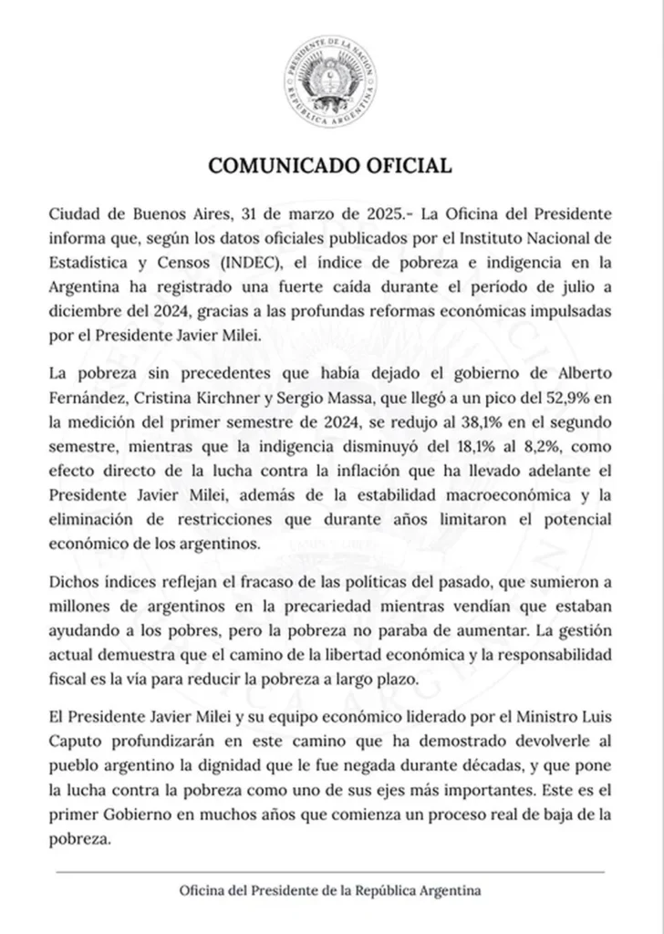 «La pobreza sin precedentes que había dejado el gobierno de Alberto Fernández, Cristina Kirchner y Sergio Massa, que llegó a un pico del 52,9% en la medición del primer semestre de 2024, se redujo al 38,1% en el segundo semestre», sostuvo la Oficina del Presidente mediante un comunicado.